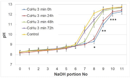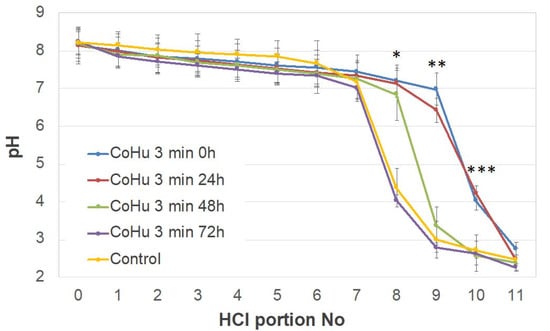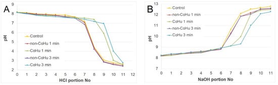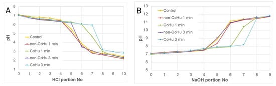 Bicarbonate buffer was prepared by dissolving 0.84 g of NaHCO3 in 1000 mL of distilled water. Tests were carried out with each group of samples separately. A 150 µL portion of 0.1 M HCl was added to 0.01 M bicarbonate buffer solution and 30–40 s later, pH value was registered with a pH-meter Ekspert-001-3pH (Ekoniks-Ekspert, Moscow, Russia) (equipped with combined platinum/AgCl electrodes). Then, the next portion of HCl was added. This procedure was continued until 10–11 portions of HCl were added. In another set of tests, 0.1 M NaOH was used for titration. This type of experiment was repeated with 0.05 M phosphate buffer with pH 7.0, and portions of HCl and NaOH were per 750 µL. A part of the samples that was treated with CoHu and non-CoHu was not used in titration immediately, but in 24, 48 and 72 h after treatment.