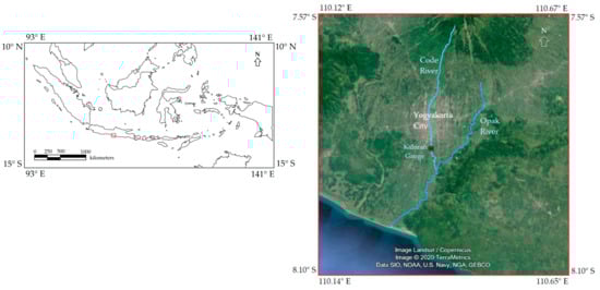 The Special Region of Yogyakarta is a small Indonesian province located in the southern central region of Java Island, occupying an area of 3179 km2. One of the main rivers in the province is Opak River. Many streams of Opak River tributaries cross in the center of the province in Yogyakarta City. One of the tributaries is Code River, a well-known stream, which often represents Yogyakarta City. Code River basin occupies an area of approximately 40 km2. Code River joins Opak River after traveling south for 41 km from its spring on Mount Merapi, north of Yogyakarta (Figure 1). As the stream is situated in a strategic location, Code River holds not only cultural value but also aesthetic value and tourism potential [].