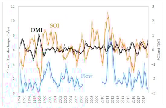 The time series of the 3- and 6-month averaged data of streamflow, SOI, and DMI are shown in Figure 2. The missing data of streamflow from the period 2006–2009 are dominated by La Niña (high SOI) events in the wet seasons of 2008 and 2009. The strong La Niña events in 2011 can cover the information of strong La Niña events on the analysis. The strong El Niño (low SOI) events captured in 1998/1999 and 2015/2016 were two of the three super El Niño events identified since 1980 [].