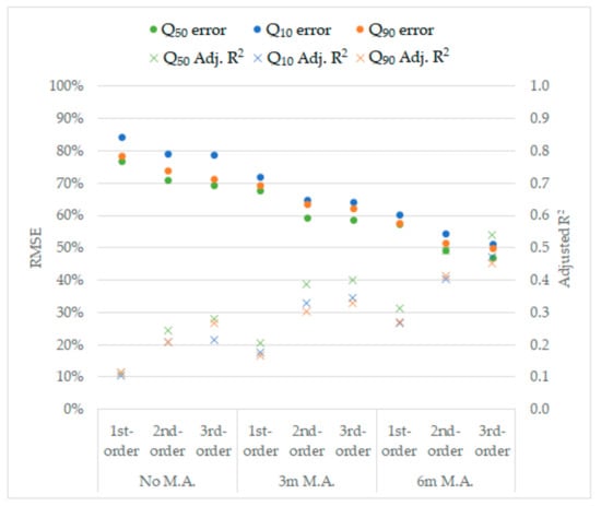 The root mean square error (RMSE) and adjusted R2 of the multiple regression (MR) models. The 1st-, 2nd-, and 3rd-order are the respective MR orders. The 3 m M.A. and 6 m M.A. are the 3-month and 6-month moving average, respectively.