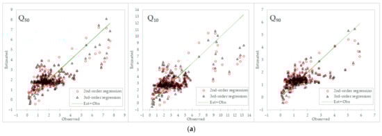 The Q90 MR models had better accuracy in the third-order MR than in the second-order MR (Figure 5). The MR models of Q90 had almost equal numbers in producing underestimated and overestimated values. However, the underestimated (overestimated) values tended to be in the higher (lower) level of Q90, while an underestimation is more favorable for anticipating drought and conserving ecosystems in rivers.