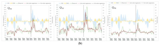 The Q10 MR models have the least accuracy among the three flow indices (Figure 5). The most accurate estimation of the model was only found in two events with a combination of positive SOI and positive DMI, in 2011–2012 and 2018. Although the accuracy of both was similar, the third-order MR was better than the second-order regression in forecasting Q10. This is because the third-order MR tended to produce a higher estimate than the second-order MR (especially in the event of positive SOI and DMI). A higher estimation of high flow is usually favored to set a safety margin in the event of floods.