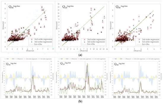 The MR with the same period variables (the MR used in Section 4.2) is labeled by lag0 and the MR with 6-month lagged variables is labeled by lag6. The lag0 regression result is provided in Section 4.2 and shows that the 6-month moving average was the best timescale to reduce variation noises and achieve the highest model skill (highest correlation with the observed flow, lowest standard error, and highest coefficient of determination). Hence, in this lagged MR, we used only the 6-month moving average dataset with second- and third-order MR. Additionally, the lag6 MR did not temporally overlap with the use of the 6-month moving average dataset. The model evaluations are shown in Table 3 and Figure 5.