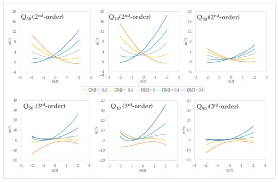 To further investigate the IOD contribution to the ENSO–streamflow relationship in the model we developed, we applied the second- and third-order regression models (6-month moving average) on varied dummy values of SOI and DMI. The range of SOI (DMI) values in the 6-month moving average dataset was −1.80 to 2.27 (−0.61 to 0.93), and thus the SOI (DMI) variation in this simulation was set from −2 to 2 (−0.8 to 0.8). The correlation of SOI–streamflow is already known to be positive; thus, a higher SOI should produce higher streamflow. In this case, we tested whether positive DMI (pDMI) and negative DMI (nDMI) changed the tendency of the positive relationship.