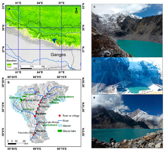 Study area. (a) Location of Poiqu River basin on regional map; (b) Poiqu River basin; (c–e) photos taken from a field investigation in October 2020, including (c) Cirenmaco, (d) Jialongco, and (e) Galongco.