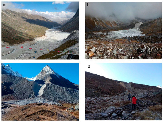 The Poiqu River basin is located on the southern slope of the Central Himalayas. This river is one of the main tributaries of the Ganges (Figure 1). Its watershed area is 2072 km2. Due to the basin’s large altitude differences, its climate includes the subtropical zone, warm temperate zone, cold temperate zone, and alpine tundra zone. Many studies have been conducted on temporal and spatial glacial lake changes, as well as hazard/risk assessment in the basin [26,36,39,40,41]. The latest results reveal that glacial lakes in the basin expanded by approximately 110% between 1964 and 2017, and the average retreat rate of glaciers was 1.4 km2·a−1 between 1975 and 2015 [21]. The area had 59 glacial lakes with mother glaciers in 2018. Galongco is the largest glacial lake in the basin and has experienced steady growth for more than 40 years, expanding from 1.23 km2 to 5.38 km2 during the period 1976–2018.