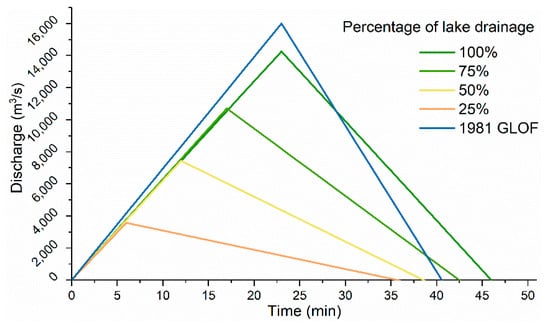 In the absence of measured or simulated data, the GLOF process line can be inferred indirectly [58,59]. We assume that the flood discharge will increase/decrease linearly. The outburst volume is then used as a control to draw the GLOF process line (Figure 3). This hypothetical method has been applied in many GLOF studies, and the results are in line with the actual situation [31,52,53].