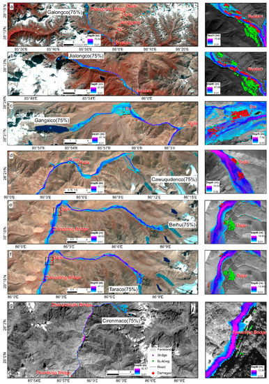 Cawuqudenco, Beihu, and Taraco are situated in the northeast of the Poiqu River basin and more than 14 villages are located downstream. If Taraco released 75% of its volume, the GLOF’s peak discharge could reach 10,494 m3/s and the inundated area could be 7.02 km2, with an average inundation depth of 5.82 m and an average flood velocity of 3.33 m/s. In addition, 5.89 km of highways, 0.83 km2 of farmland, 37 buildings, and 12 bridges could be at risk. The destructiveness of the Cawuqudenco and Beihu GLOFs are similar to the Taraco GLOF (Figure 4d–f). Cirenmaco is the most dangerous glacial lake in the Poiqu River basin. If it suddenly drained (under a 75% drainage scenario), the inundated area could be as large as 2.48 km2, with an average depth of 10.84 m (Figure 4g).