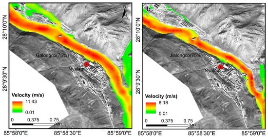 Velocity of GLOFs originating from (a) Galongco and (b) Jialongco under a 75% drainage scenario.