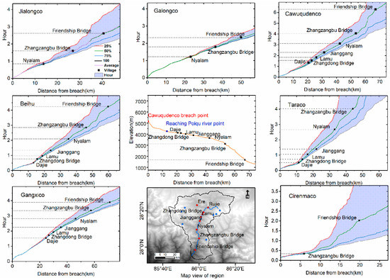 Figure 6 displays the estimated arrival time of peak discharge in the main villages and towns. The large amount of water, high peak discharge, and long duration of a Gangxico GLOF could cause the most severe damage to the Poiqu River basin. Except for villages like Ere that are very close to the glacial lake and would be quickly inundated, other settlements would have enough time to evacuate since the GLOF is projected to travel a long distance before it enters the main channel of the Poiqu River. Taraco, Beihu, and Cawuqudenco GLOFs might take more than 30 minutes to flow from tributaries to the main stream. In addition, GLOFs from Jialongco or Galongco might take at least 55 minutes to reach the upper district of Nyalam, even in the fastest moving scenario. Therefore, a GLOF early warning system at the glacial lake would be an important measure to reduce the loss of life and property.