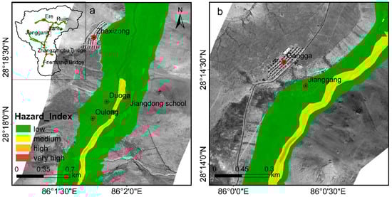 GLOF hazard levels along the upper Poiqu River, around the (a) Jiangdong Bridge, and (b) Jianggang village.