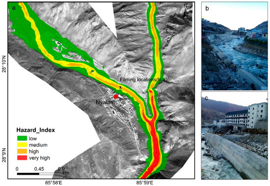 GLOF hazard levels in (a) Nyalam County and (b,c) along the river. (b) View upstream and (c) view downstream.