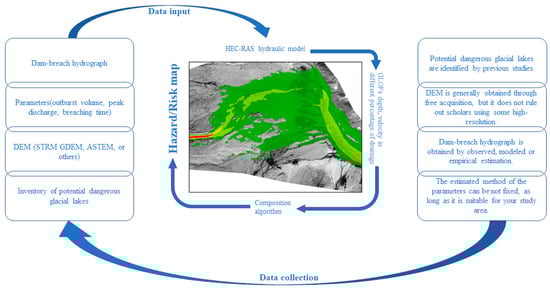 Due to the destructive impact of GLOFs on downstream areas, mitigating these risks has become a focus of GLOF research. Timely and effective assessment mapping is important in understanding GLOF propagation. Such mapping plays a significant role in downstream land use and urban planning, as well as in the application of prevention measures. However, some models cannot be freely downloaded or are difficult to use in the simulating process. As a result, practitioners’ efforts to learn more about glacial hazard/risk have been hampered. In this study, we aimed not only to assess future GLOF hazard/risk in the Poiqu River basin, but also to provide a paradigm for hazard assessment and risk management that uses an easier method, thus enabling broader application (Figure 10). Most of the data can be collected through free channels. The main processes are as follows: