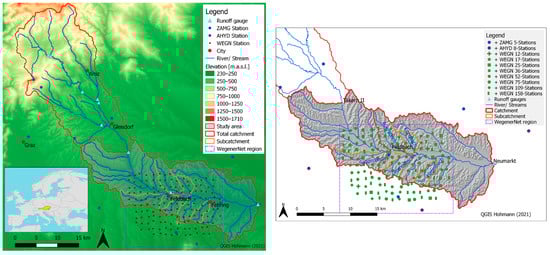 The total study area is moderately hilly with elevations ranging from 230 to 530 m. The land use is predominately agricultural with some patchy forest areas. The dominant soil texture is sandy loam. The mean annual precipitation is around 850 mm, and the mean annual temperature about 9.5 °C. The study area was chosen because of its vulnerability to heavy/convective precipitation events [41] and climate change [46], as well as the data availability. Since the region has a very dense climate network, the WEGN, which is operated by the Wegener Center for Climate and Global Change, University of Graz, Austria [36]. The WEGN has been used to measure precipitation, temperature, humidity, and other variables since early 2007 and includes 150 stations within an area of around 23 × 18 km. All data are quality controlled by the WEGN QC system [36], and additional bias correction is implemented for precipitation data [47].