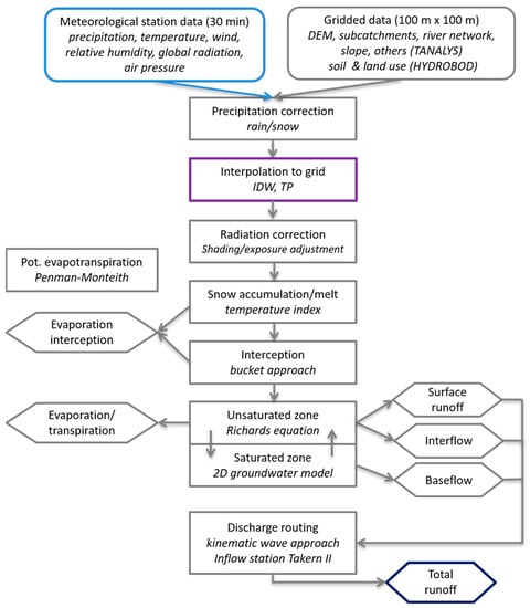 WaSiM model setup, including modules and input datasets used in this study (created after scheme of Schulla [56]). The focus of this study was to evaluate runoff output data (box marked in dark blue) as simulated by WaSiM with various precipitation data resolutions at input (blue box), and using different interpolation schemes (violet box) IDW—inverse distance weighting and TP—Thiessen polygons.