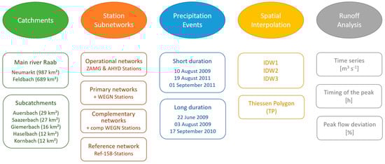 Overview of the study design with total catchment and subcatchment areas, gauge station subnetworks (ZAMG—data from the Austrian Weather Service; AHYD—data from the Austrian Hydrographic Service; WEGN—highly dense station network), and full precipitation network (Ref-158-Stations), analyzed short-duration and long-duration events, spatial interpolation schemes (inverse distance weighting with power of 1 (IDW1), power of 2 (IDW2) and power of 3 (IDW3); Thiessen polygons (TP)) for precipitation input data, and the key runoff output data analyzed.
