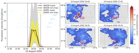 Precipitation time series of the “short-1 event” measured at WEGN and ZAMG stations (left panel) throughout the WEGN network area (purple box in the four panels on the right). In the panel on the left, “WEGN” shows mean areal precipitation computed from the 150 stations (black line) with a min–max range among the stations (gray shaded), while “ZAMG” shows mean precipitation (red line) obtained from the 3 ZAMG stations with a min–max range across the stations (yellow-shaded). The map sequence in the four panels on the right shows the evolution of the precipitation event as revealed by the gridded INCA analysis across the WEGN network (purple box) and the Raab catchment area (red line).