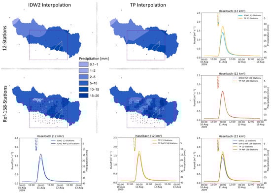 Exemplary precipitation maps using the WaSiM interpolation schemes of inverse distance weighting with power of 2 (IDW2) and Thiessen polygons (TP) for the short-1 event (10 August 2009 at 17:30), for the 12-Stations and Ref-158-Stations subnetwork cases (four panels on the upper-left). The time series (bottom row and right column panels) show the precipitation (dashed, from top) and the modeled runoff (solid) of this event in the representative small subcatchment of Haselbach (12 km2).