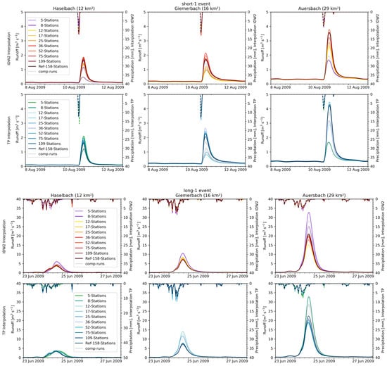 On the one hand, the inclusion of data from a specific number of stations leads to large changes in simulated runoff in many subcatchments. Giemerbach shows such a large step/change from the 25- to the 36-Stations case (e.g., in the short-1 event when using the TP interpolation, the value for the 25-Stations case is around −50%, and for the 36-Stations case +30%). These large steps are especially noticeable for the short-duration events, but are also measurable for the long-duration ones. The Haselbach subcatchment also shows this behavior, but between the 17- and 25-Stations cases.