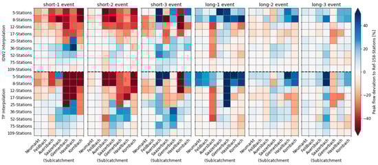 Figure 7 shows the peak flow deviations as calculated with Equation (3) for all analyzed station cases and for the IDW and TP interpolations, respectively. The interpolation schemes of IDW1 and IDW3, as well as all results of the complementary subnetworks, are plotted in Appendix A (Figure A4). We can see that the different short- and long-duration rainfall events lead to a significantly different runoff picture, while the interpolation schemes and different catchments are much more similar. Lower station densities (<12-Stations) mostly show larger deviations from the Ref-158-Stations full network case (darker colors) than cases with more stations (lighter colors).