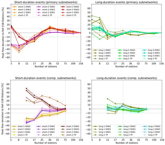 Peak flow deviation between the Ref-158-Stations case and the mean across all (sub)catchments for all subnetwork cases (x-axis of panels) and interpolation schemes (different line styles, see legend) IDW2, IDW3, and IDW1—inverse distance weighting with powers of 2, 3, and 1, TP—Thiessen polygons, respectively, for the three short events (left) and the three long events (right). The data shown in the upper panels were calculated based on the ten primary subnetwork cases (5- to 158-Stations) and in the lower panels, for the six complementary ones (12-comp- to 75-comp-Stations).