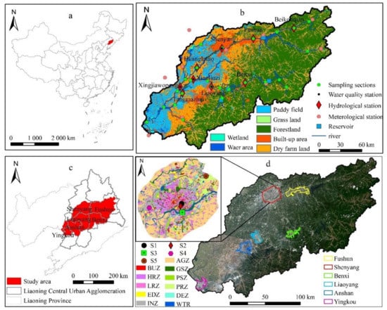 The Hun-Taizi River watershed and the built-up area in Liaoning Province, China. (a) China; (b) The land use map, meteorological, hydrological, water quality stations and sampling sections in the Hun-Taizi River watershed; (c) The distribution of the study area and the Central Liaoning Urban Agglomeration in Liaoning Province; (d) The built-up area of six cities and rainfall runoff sampling sites of different functional zones in Shenyang. Business zone (BUZ), high density residential zone (HRZ), low density residential zone (LRZ), educational zone (EDZ), industrial zone (INZ), agricultural zone (AGZ), green space zone (GSZ), public service zone (PSZ), preservation zone (PRZ), development zone (DEZ), and water (WTR); S1, S2, S3, S4 and S5 were the rainfall sampling sites in BUZ, EDZ, HRZ, INZ and PRZ, respectively.