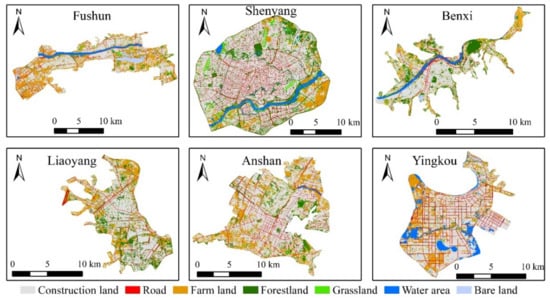 Landsat 8 OLI images in 2017 were used to manually interpret the built-up area of Shenyang, Fushun, Benxi, Liaoyang, Anshan and Yingkou (Figure 1d). The land use map of the built-up area was interpreted based on the Sentinel 2 images in 2017 (10 m × 10 m), including construction land, road, grassland, forestland, farmland, water area and bare land (Figure 2). The accuracy of interpretation was 88.5% compared with 360 field survey points in 2017.