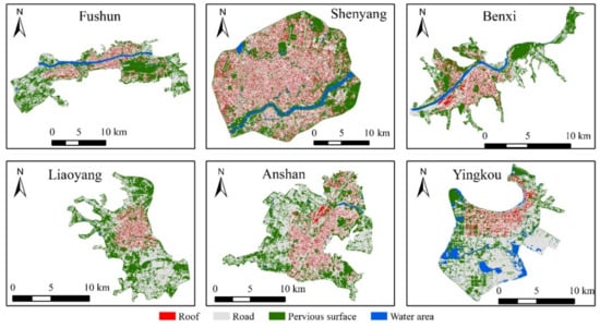 The roof dataset of the six cities was extracted from the QuickBird images (0.61 × 0.61 m), which was collected in 2013 using the software package Brista and updated in 2017 [39]. The land use map of the urban area in 2017 was updated by the roof map. For further analysis, the land use types were reclassified as roof, road (including road and other construction land), pervious surface (grassland, forestland, farmland and bare land) and water area (Figure 3).