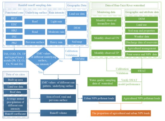 The integrated agricultural and urban NPS study framework was proposed based on the SWAT, the EMC method, and the SWMM (Figure 5). The data collected in the study area were used to quantify the agricultural NPS pollution loads. Geographic data and monthly monitoring data were adopted to establish, calibrate and validate the SWAT. Rainfall runoff sampling data from diverse underlying surfaces of different functional zones and rain intensities were used to calculate the EMC values of TSS, COD, TN, TP and heavy metals. In the absence of rainfall runoff sampling data, the geographic data and the rainfall runoff sampling data of the built-up area were used to establish, calibrate and validate the SWMM, which was adopted to simulate the NPS pollution loads. EMC values were calculated as the total load divided by the runoff volume. The urban NPS pollutant load was calculated using average EMC values of different underlying surfaces and rain intensities; the area of roof, road and pervious surfaces; the average annual precipitation of different rain patterns; and the runoff coefficient.