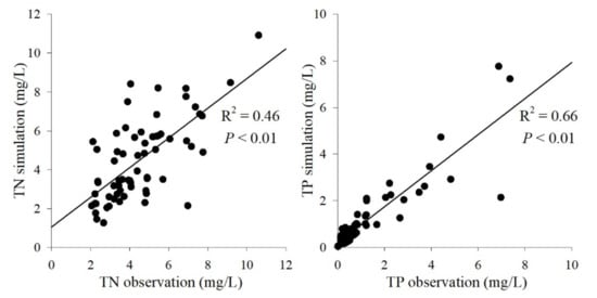 Water quality samples from the Hun-Taizi River watershed and the simulated concentrations of TN and TP were used to further verify the SWAT simulation results. The concentrations of TN and TP were calculated by the simulated TN and TP yield divided by the runoff volume at each monitoring section. The R2 values for TN and TP were 0.46 and 0.66 (p < 0.01), respectively (Figure 6). There was a significant correlation between the NPS pollutant concentration simulated by the SWAT and the observed data.