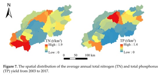 The spatial distribution of the average annual total nitrogen (TN) and total phosphorus (TP) yield from 2003 to 2017.