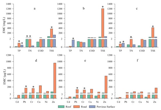 The average event mean concentration (EMC) values of total phosphorus (TP), total nitrogen (TN), chemical oxygen demand (COD), total suspended solids (TSS) and six heavy metals (Cd, Pb, Cr, Cu, Ni, and Zn) for different underlying surfaces and rainfall intensities. (a) and (d) EMC values of urban non-point source (NPS) pollutants in light rain; (b) and (e) EMC values of urban NPS pollutants in moderate rain; (c) and (f) EMC values of urban NPS pollutants in heavy rain. * The concentration of the NPS pollutant constituent exceeded the standard.