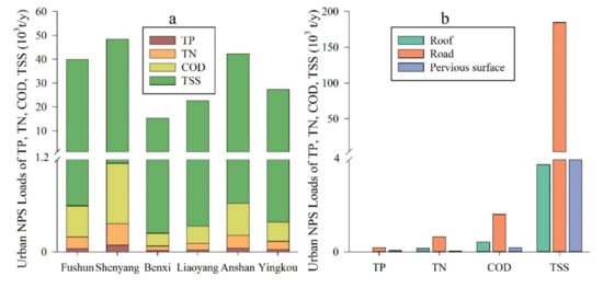 The total urban NPS pollution loads in the six cities for TP, TN, COD and TSS were 266, 853, 2250 and 192,000 t/y, respectively (Figure 9). Shenyang city had the highest urban NPS pollutant loads of TP, TN, COD and TSS, which were 91, 281, 784 and 47,200 t/y, respectively (Figure 9a). The per unit areas of road for TP, TN, COD and TSS were 0.34, 1.22, 3.05 and 345.18 t/km2, of roof for TP, TN, COD and TSS were 0.07, 0.83, 2.35 and 20.41 t/km2, and of pervious area for TP, TN, COD and TSS were 0.16, 0.11, 0.43 and 9.59 t/km2. For the whole study area, roads had the highest urban NPS pollutant loads (Figure 9b). TP, TN, COD and TSS in the road runoff accounted for 69.4%, 76.8%, 75.5% and 95.9%, while in the roof runoff, they accounted for 4.7%, 18%, 19.4% and 2.0% of the total urban NPS pollutant, respectively. The pollutant load of TP in pervious surface runoff was 68.9 t/y, accounting for 25.9% of the total TP load.