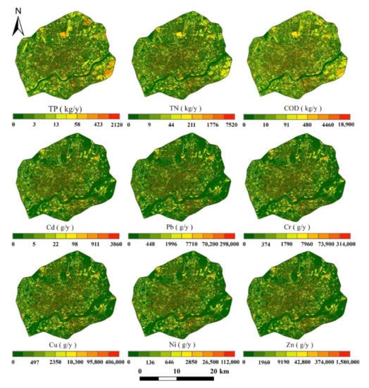 The spatial distribution of total phosphorus (TP), total nitrogen (TN), chemical oxygen demand (COD) and six heavy metals (Cd, Pb, Cr, Cu, Ni, and Zn) loads in the built-up area of Shenyang city.