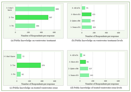 - The following section examines participants’ knowledge about water use in Al Ain, and wastewater treatment and reuse. It also includes questions on respondents’ sources of information. In line with existing literature [19,33], six water and TWW awareness questions were included in the questionnaire, for each question, participants are presented with multiple choices, of which only one is the right answer.
