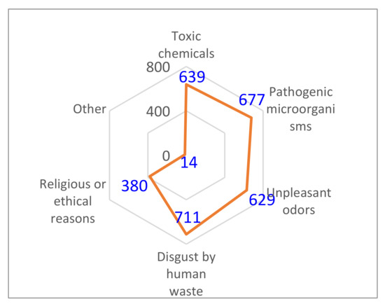 A good share of participants justified their hesitations regarding the reuse of TWW by Disgust by Human Waste (50.1%), Pathogenic Microorganism (47.7%), Chemical Substances (45.1%), and bad odor (44.4%), while only 26.8% claim to be hesitant for religious or ethical reasons (Figure 4).