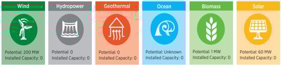 Ocean renewable energy (ORE) conventionally includes waves, kinetic (tides and currents), ocean thermal energy conversion, and salinity gradients, but can also include offshore wind and solar given their installation in marine environments. ORE is a major component of the blue economy but, excluding a photovoltaic microgrid installed on Ragged Island that has a capacity of 402 kW and other small-scale solar installations, renewable energy in general is limited in The Bahamas, accounting for <0.1% of total electricity generation. In the Bahamas Energy Snapshot prepared by the National Renewable Energy Laboratory (NREL), the status and potential of various sources of renewable energy was collated [] and is shown graphically in Figure 1. There, the potential of biomass, solar, and wind energy were measured at 1, 60, and 200 MW, respectively, though no details as to how the potentials were calculated and, thus, no independent assessment can be conducted. Crucially in the NREL estimation, wind and solar resources offered the greatest potential for renewable energy development in The Bahamas, but it should be noted that the potential of the ocean was not quantified. Given NREL’s defined ORE potential status as “unknown”, this represents a significant blind spot and a major hurdle in assessing and exploiting its actual renewable energy resources.