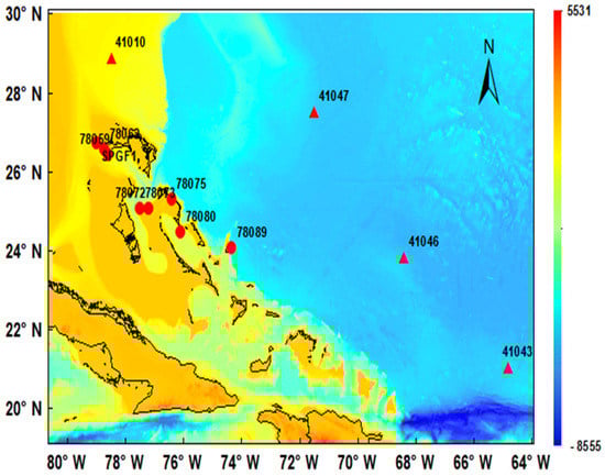 Sustained ocean observations support not only essential scientific research, but also undergirds a diverse range of activities related to safety, operational efficiency, and governance [,,,,]. Limited resources and capacity of The Bahamas government to independently conduct and sustain research would restrict the expansion of blue economy activities. This is seen in other jurisdictions, such as Mauritius, where Komul et al. [] found a limited ability to collect data and effectively analyze it, and a lack of collaborative research and other cost-effective approaches hampered the protection of the nation’s SSFs. Other SIDS were characterized as having similar problems where, crucially, using the Mauritian SSFs as an example, they found that SIDS were hampered. These issues were attributed to a lack of qualified personnel, specialized equipment, and funding. Several National Buoy Data Center (NDBC) buoys located in the Atlantic Ocean east of the Lucayan Archipelago (Figure 3) provide in situ observations, but no platforms in the nearshore currently exist, thus requiring other sources of data. For convenience and completeness, land-based Bahamas Department of Meteorology and a C-MAN station owned and maintained by the NDBC that can be used for wind energy analyses are also plotted. Corresponding statistics are given in Table 2. It can be observed that each buoy lies hundreds of kilometers away from the nearest Bahamian island, which renders their observations useless for nearshore applications. Similarly, operational land-based platforms are also limited and concentrated in the northern Bahamian islands where most of the country’s population resides. Numerical models or reanalysis data can be used to supplement this information gap, but in each case, require observations to validate their products. These models, however, require significant computational resources and technical expertise to set up, tune, validate, and convert into a format readily digestible for decision-makers, none of which, to the author’s best knowledge, currently exists.