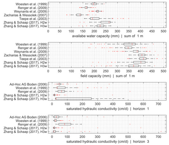 In order to quantitatively evaluate and compare the characteristics of the water retention curves and hydraulic conductivities of the different PTFs, we considered the variables of plant-available water capacity (AWC), field capacity (FC), and saturated hydraulic conductivity (Ksat). The FC corresponds to the pore volume which is filled with water at a matric potential of pF = 1.8. The AWC is the respective pore volume between pF = 1.8 and pF = 4.2. Values of FC and AWC were determined for each grid cell for the uppermost meter of the soil profile, and Ksat was analyzed for individual soil horizons. The distribution of these values were statistically examined using box plots analysis, considering only cropland, grassland, and forest areas. In addition, demonstration of the spatial distribution of these three variables (AWC, FC, Ksat) can be used to establish qualitative relationships between soil hydraulic properties and land use distribution or topography.