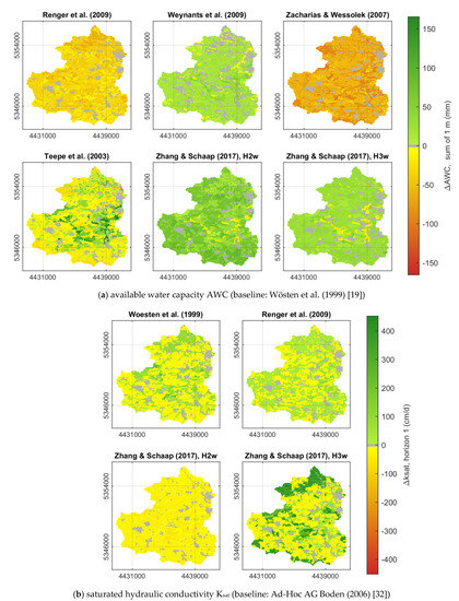 The largest spatial variation of the AWC differences (∆AWC) was found for Teepe et al. (2003) [38]. Here, the soil water storage capacities of flat areas with forest or grassland cover are increased (compared to baseline scenario), while decreased for other land uses. This observation is in accordance with the distribution displayed in Figure 2, which shows a similar median as the baseline scenario, but a distinctly larger variability. The PTF of Zacharias & Wessolek (2007) [37] results in an overall lower soil water storage with lower values in valleys and thus a contrasting behavior compared to Teepe et al. (2003) [38]. Weynants et al. (2009) [36] and both versions of Zhang & Schaap (2017) [39] show a predominantly higher soil water storage with some exceptions next to the rivers. In most cases, the areas of lower AWC in Weynants et al. (2009) [36] are not equal to those of Zhang & Schaap (2017) [39].