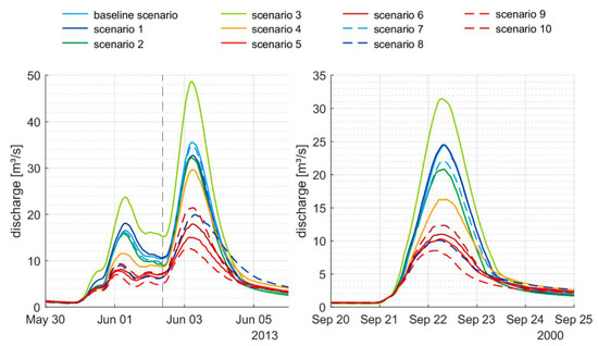 Hydrographs of the baseline scenario and the 10 scenario runs for two exemplary events (scenario description: Table 3).