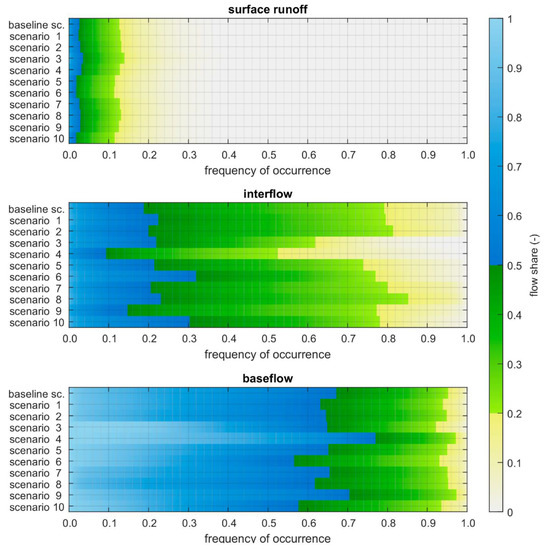 Figure 5 shows the frequency of occurrence of different flow shares for all runoff components. Blue colors indicate the dominance of the respective component (probability > 50%), green colors indicate a flow share of 20–50%, whereas yellow to grey colors indicate a probability below 20% for the respective runoff component. Scenarios 5, 6, and 10 show the shortest time periods dominated by surface runoff. While Scenario 5 shows dominance of baseflow in relatively longer time periods, Scenarios 6 and 10 remarkably indicate longer periods with interflow as dominant runoff generation process. Scenarios 4 and 9 have the shortest periods with dominant interflow but the longest with baseflow as the dominant runoff generation process.