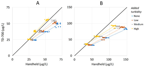 Comparison between the extracted total chlorophyll-a using TD-700 vs. the chlorophyll-a estimated from the in vivo measurements using the FluoroSense probe across the different added turbidity levels (none (blue), low (brown), medium (grey), and high (yellow)) and three different sample dilutions from the Lakeside and Silverbell Lake water samples (panels (A,B), respectively). For all panels, the solid black line illustrates a 1:1 relation between the two measurement techniques.