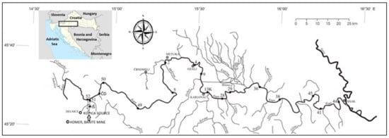 The map of Croatia, with a rectangle indicating the position of the Kupa drainage basin, the course of the Kupa River, and its catchment area showing sediment sampling locations are presented in Figure 1. The total area of 10,605 km2 of the Kupa River drainage basin is divisible into several sub-basins as per its countrywide distributions: 79.32% belongs to Croatia, 18.32% to Slovenia, and 2.36% to Bosnia and Herzegovina. The river basin is one of the most significant water resources in Croatia. Although shared by other adjoining countries, about 85% of the river water, being chiefly derived from carbonate karst springs, river springs, precipitation, and run off, discharges on the Croatian side. The karst aquifiers of the Dinarides are highly vulnerable because of the rapid water exchange with the groundwater through numerous shallow holes. The availability of about 3.5 m3/s of very good quality spring water has given a strategic importance to the area based on the fact that the whole Adriatic coast and numerous settlements in the continental area have come into existence [].