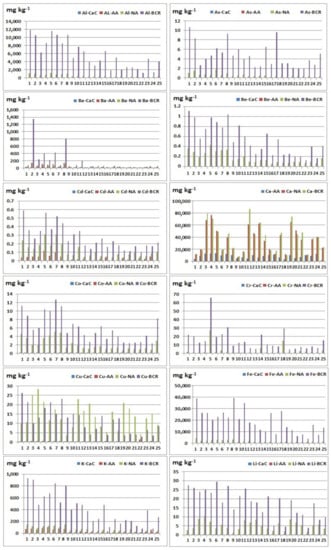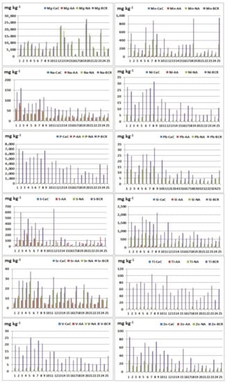 Nitric acid extraction in comparison with CH3COONH4 gave better results when extracting the following elements: Al, Be, Ca, Cd, Co, Cu, Fe, K, Li, Mg, Mn, Ni, P, S, Sb, Si, Sr, Ti, V, and Zn, where the observed ratio is noticeable for the elements: Al, Co, Cu, Fe, Li, Mg, Mn, P, Ni, Si, V, and Zn (Table S2). During the extraction of arsenic, chromium, and lead, values below the detection limit in all samples were obtained, so these ratios could not be calculated. When determining barium, the observed ratio was calculated in 25 samples, in which in 20 samples, a better result was obtained during extraction with ammonium acetate. When determining sodium, the observed ratio was calculated in 25 samples, in which in 12 samples, a better result was obtained during extraction with ammonium acetate. When determining sulphur, the observed ratio was calculated in 25 samples, in which in 13 samples, a better result was obtained during extraction with ammonium acetate. These results can be explained by the high heterogeneity of the studied sediments with significant differences in the geochemical composition of the substrates. In most samples, better results were obtained after nitric acid extraction, but it should be noted that a significant amount of barium and sodium was extracted using ammonium acetate. This result is consistent with [] and [] that extraction with ammonium acetate may be used to assess the amount of available K, Na, Li, Ba, Mg, and Ca.