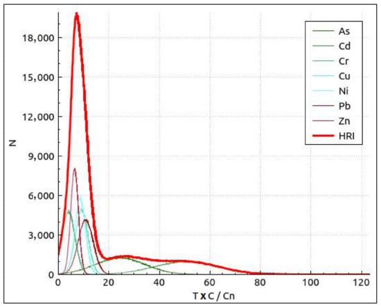 In the presented research, instead of Håkanson’s RI, the probabilistic distribution of RI was calculated using the Monte Carlo simulation. The potential ecological risk index (RI) in sediments can be calculated using the following equation [,]: RI = ∑ Eri, where Eri = Tri Cif, Tri is the toxic-response factor for a given substance (for Hg, Cd, As, Cr, and Zn, they are 40, 30, 10, 2, and 1, respectively; and five for Pb, Cu, and Ni) [,], and Cif is the contamination factor []. Eri i is the potential ecological risk for single factor, and RI is calculated as the sum of all risk factors for heavy metals in sediments.