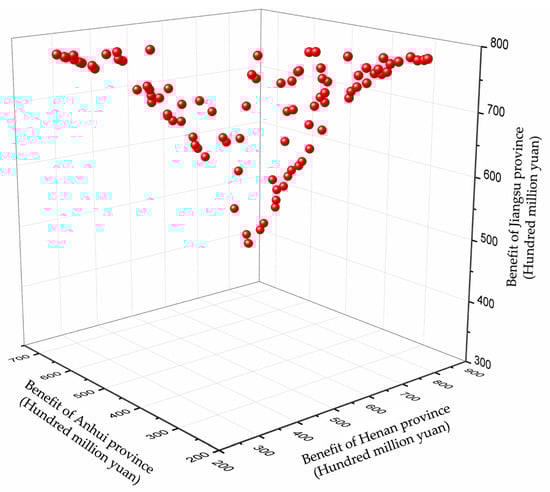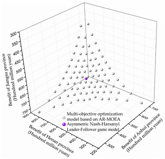 Because the AR-MOEA method is superior in the diversity metric () when solving the multi-objective optimization model of the Huaihe River basin water resources allocation, we choose the AR-MOEA method to solve the multi-objective optimization model of water resource allocation in the Huaihe River basin. Then, we compared the water resources allocation results based on the the asymmetric Nash–Harsanyi Leader–Follower game model and the multi-objective optimization model based on the AR-MOEA method. The benefits for the three provinces of Huaihe River obtained by the two model are shown in Figure 6.