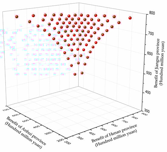 Figure 5 shows the Pareto front of multi-objective optimization based on the AR-MOEA method in the Huaihe River basin. In Figure 5, the points on the Pareto front solved by the AR-MOEA method are uniformly distributed.
