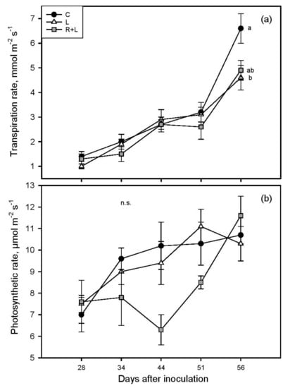 Transpiration (EL) (a) and photosynthetic (A) (b) rates as measured in control (C, closed circles), leaf infested (L, open triangles), and both root and leaf infested (R+L, grey squares) plants during the treatment application (n = 5–8). Different letters denote significant differences among groups; n.s. indicates lack of statistically significant differences.