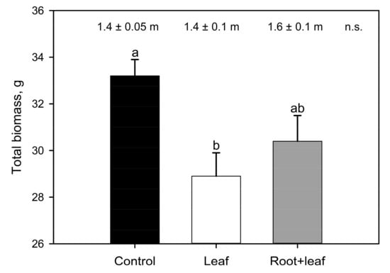 Total plant biomass (histogram) and absolute shoot length (top part) as measured in control (C, black bar), leaf infested (L, white bar), and both root and leaf infested (R+L, grey bar) plants 56 days after inoculation. Different letters indicate significant differences among groups (one-way ANOVA); n.s. indicates lack of significant differences.